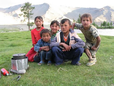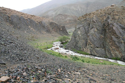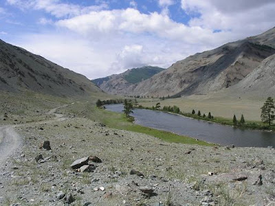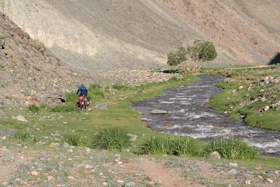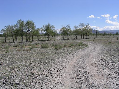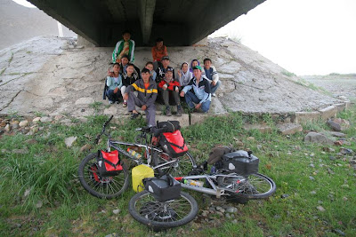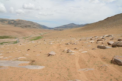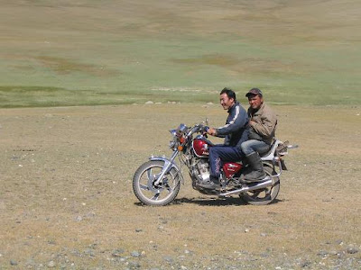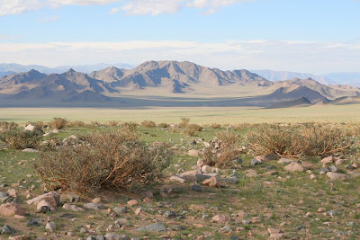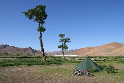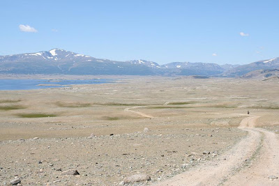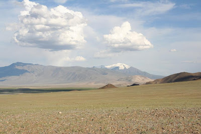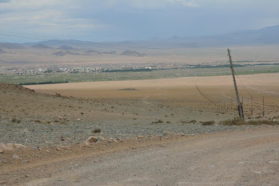 From Bayankhongor we headed back into the mountains to the northwest towards Kharkhorin. The first stop was Shargaljuut, an area with hot springs and an old fashioned sanitorium. After that we tried to get to the Orkhon valley via Naiman Nuur national park although we were uncertain if there were any tracks going all the way through. After several passes and a lot of asking directions at gers we got to the southern most lake in the volcanic Naiman Nuur area and there the road stopped. However, we could see the other end of the lake with the binoculars and it looked like there were some people camping with a truck. We decided to follow the horse trail around the lake to try to pick up the track on the other side. The horse trail started easy but got very rocky and steep near the end of the lake. Fortunately for us, the Mongolian family camping on the other side of the lake saw us struggling and 2 young guys came to help us carry the bikes and luggage over the last 200 m of the steep horse trail. Two days of cycling along the edge of a lava flow brought us to the Orkhon valley and the Orkhon waterfall. It was a bit of a culture shock to arrive at the waterfall, ger camps all around and 100-200 mostly Mongolian tourists. We have now clearly arrived on the popular tourist routes and the next day, after 6 weeks of cycling through Mongolia, we saw the first other tourist cyclists near Khujirt. Between Khujirt and Kharkhorin the asphalt started and we expected to have an asphalt road all the way back to Ulaanbaatar, ca 400 km. In Kharkhorin we stayed in a ger camp just outside the famous Erdene Zuu monastery. And to everyone's surprise, we met Freek and Ellen in the ger camp in Kharkhorin! I knew of course that they were in Mongolia, but not when they would be in Kharkhorin. We had 2 hours overlap and exchanged travel experiences over a nice lunch.