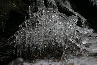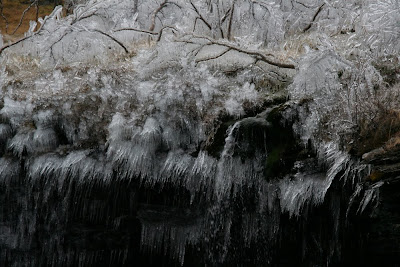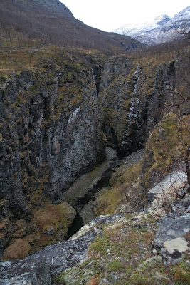 We went to Kåfjorddalen last weekend, some 150 km east of Tromsø, and it turned out to be a fascinating place. There are 2 deep canyons, one of them apparently the deepest of northern Europe, and there are old copper mines up in the mountains with ruins of the smelter, cablecar and various buildings for the workers and the director down in the valley, Ankerlia. The mines closed in 1918, but you can still clearly see the damage of the sulphuric smoke from the smelter to the surroundings. There is very little snow yet for the time of the year, but it has been cold and there were some excellent icy waterfalls and other ice formations.