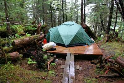 Een van de kampeerplaatsen, met tent platformen, een eenvoudig toilet en beer containers.