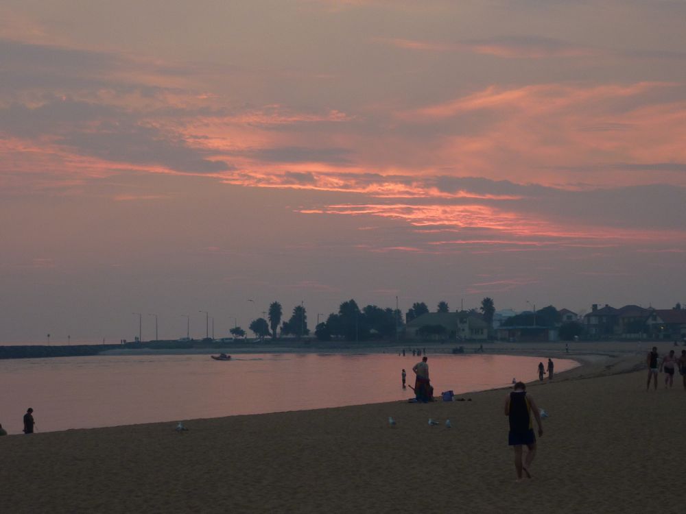 Smoke in the air gives a pink sunset on a Melbourne beach