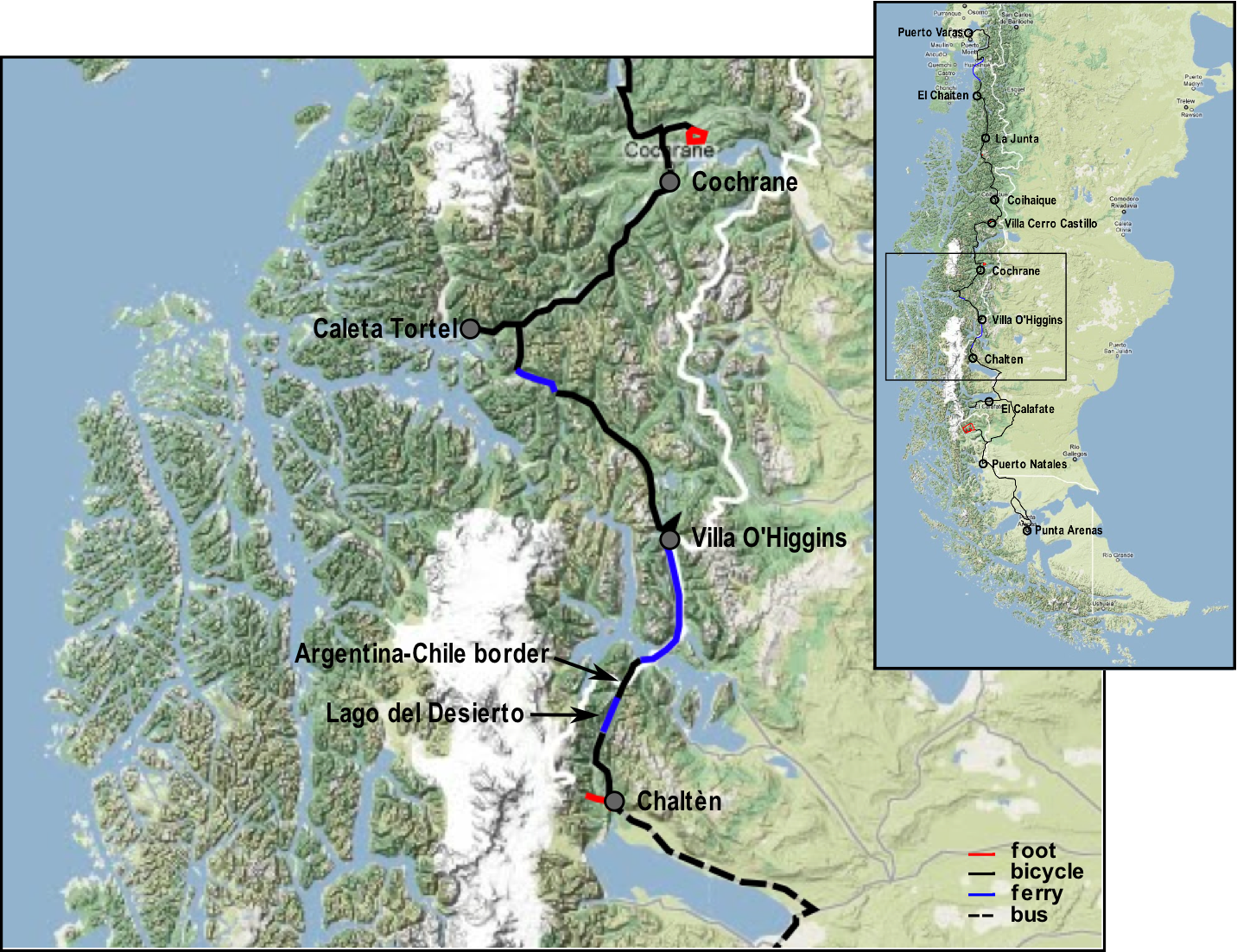 We arrived in Cochrane last night and spending a day here relaxing, shopping and doing the washing. From El Chalten we cycled to Lago del Desierto, where we took the ferry across to the other side and cleared Argentinian customs. The next day we pushed our bikes 7 km along forest trails, with brilliant views back to Mount Fitz Roy and Mount Cerro Torre, to the Chilean border. Here the road started and we cycled down to the coast at Candelario Mansilla where we cleared Chilean customs. After a relaxing morning, we took the ferry to Villa O´Higgins, together with 2 more cyclists and 4 backpackers. Three days cycling and a short ferry later we arrived in Caleta Tortel, an old fishing village with no roads, but only boardwalks connecting the houses. Two more days cycling got us here to Cochrane. The weather has been very good, a little too hot at times (who said Patagonia was cold and wet?), but the horseflies can be quite annoying.