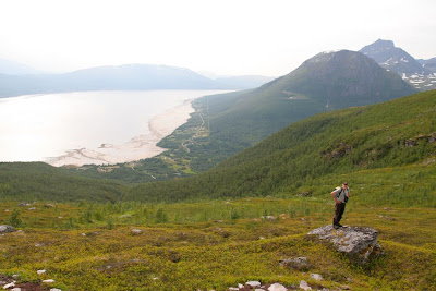 Another ti-på-topp tur on a warm Sunday, this time we chose a proper mountain, 1180 m high. Blåtinden, or better known as the 'sovende soldat', the sleeping soldier, at the southern end of Lavangsdalen about 30 km SE of Tromsø. There were very few people here and most of them were going down when we went up, so we had the top for ourselves. Blåtinden is one of the mountains with a nearly flat top plateau, a relatively common but not well understood landscape feature that I am interested in. This particular plateau is virtually parallel to the bedding/layering in the quartzitic rocks, there is little evidence of glacial erosion, and the stones appear to be more or less in situ.