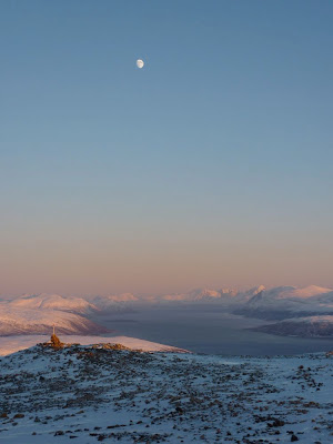 There is more ice than snow in Tromsø when we got back. We don't have the extreme cold temperatures as in other parts of Europe (-23C in The Netherlands!), but today the temperature has dropped to -16C, which is quite cold for Tromsø. As we didn't want to start our skiing season on hard icy snow, we decided to go for a snowshoe trip instead - a short trip up the local mountain Kjølen in beautiful winter weather. Hopefully we will get some fresh snow next week.