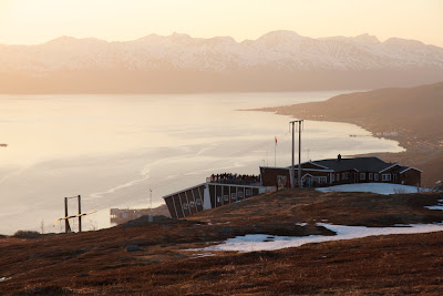 I have come back to Tromsø for a few days to watch the last Venus passage for more than a hundred years. As the passage happened in the middle of the night here, between midnight and 7 am, Tromsø, with its midnight sun, is the perfect place to watch it. We hiked up to the top of the cable car at Fløya to get a good view of the midnight sun and Tromsø. Quite a few people had the same idea, and there was an impressive collection of telescopes set up on the deck outside the cable car station. We don't have a telescope, but we still got a good view of the sun with sun spots and Venus through our binoculars. Once back home at around 3 am we could see the passage from our upstairs north-facing bedroom.