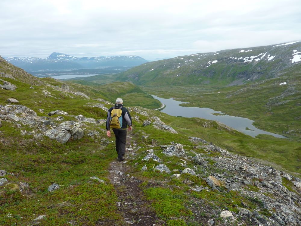 Walking down from Sørtinden, with Tromsø and Tromsdalstinden in the distance.